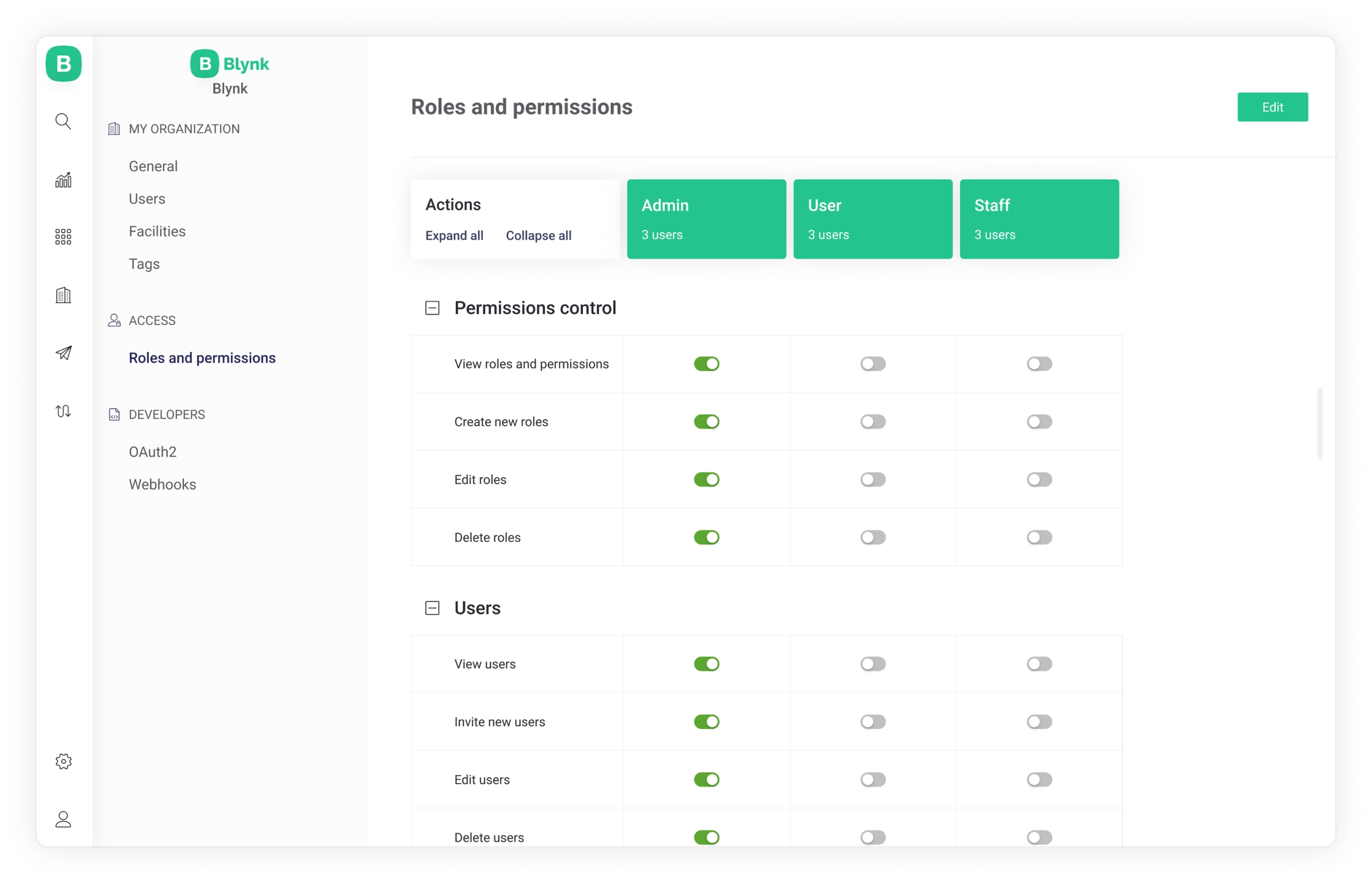 Blynk is a multi-tenant solution that allows you to configure user access to devices and data by defining roles and permissions.