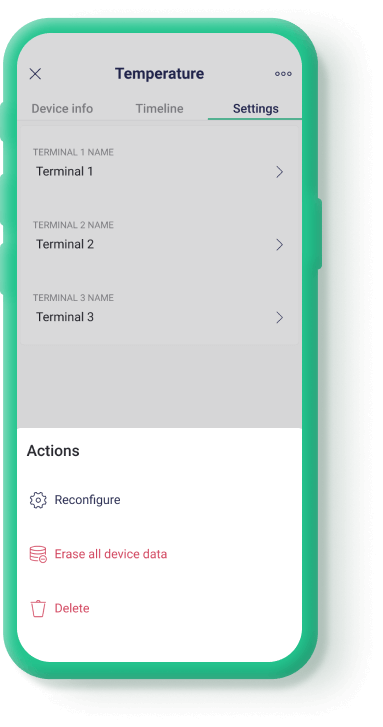 At the top right corner of the Device Info and Timeline tabs, there's Configure (gear) _**_icon that opens an actions menu with the following options: