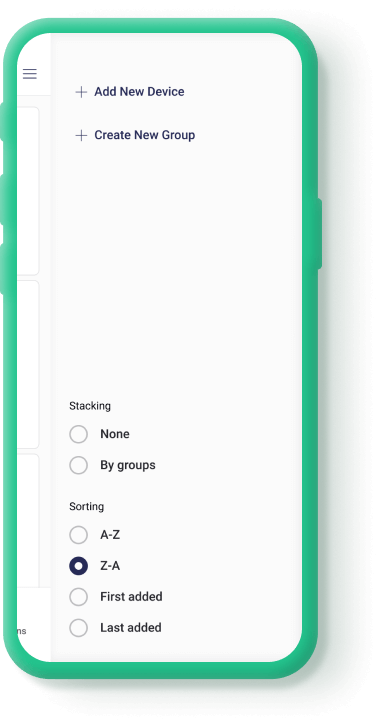 This menu also offers the various sorting and stacking options for the devices and device groups list.