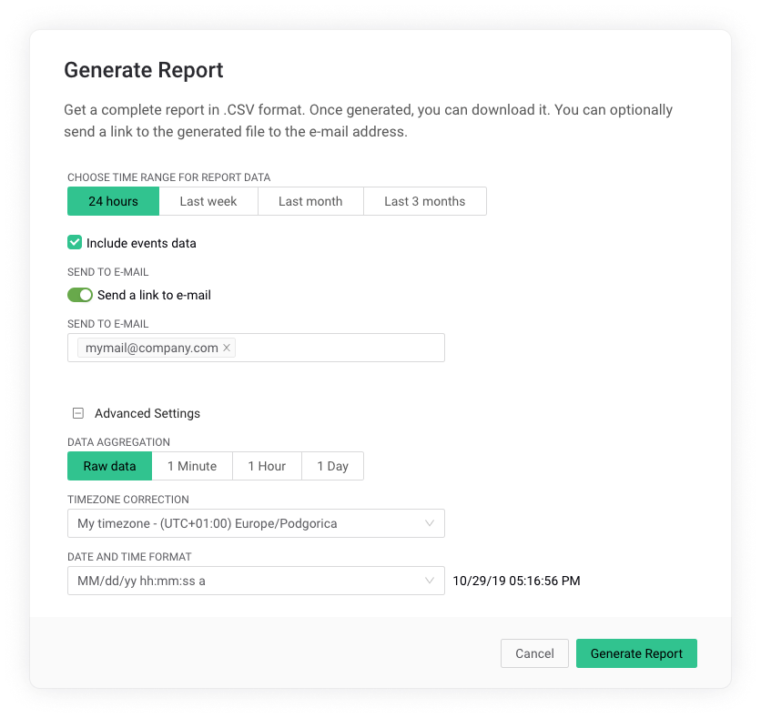 Data Aggregation: defines how data in the report will be aggregated (compressed). Aggregation means that data will be averaged to 1 value per selected time range.