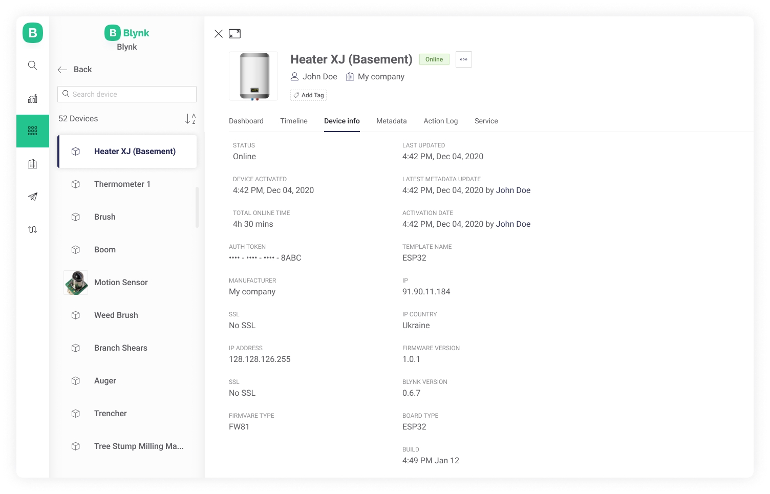 Blynk Version – version of Blynk Library used in the firmware (it can be changed by flash or Blynk.Air)