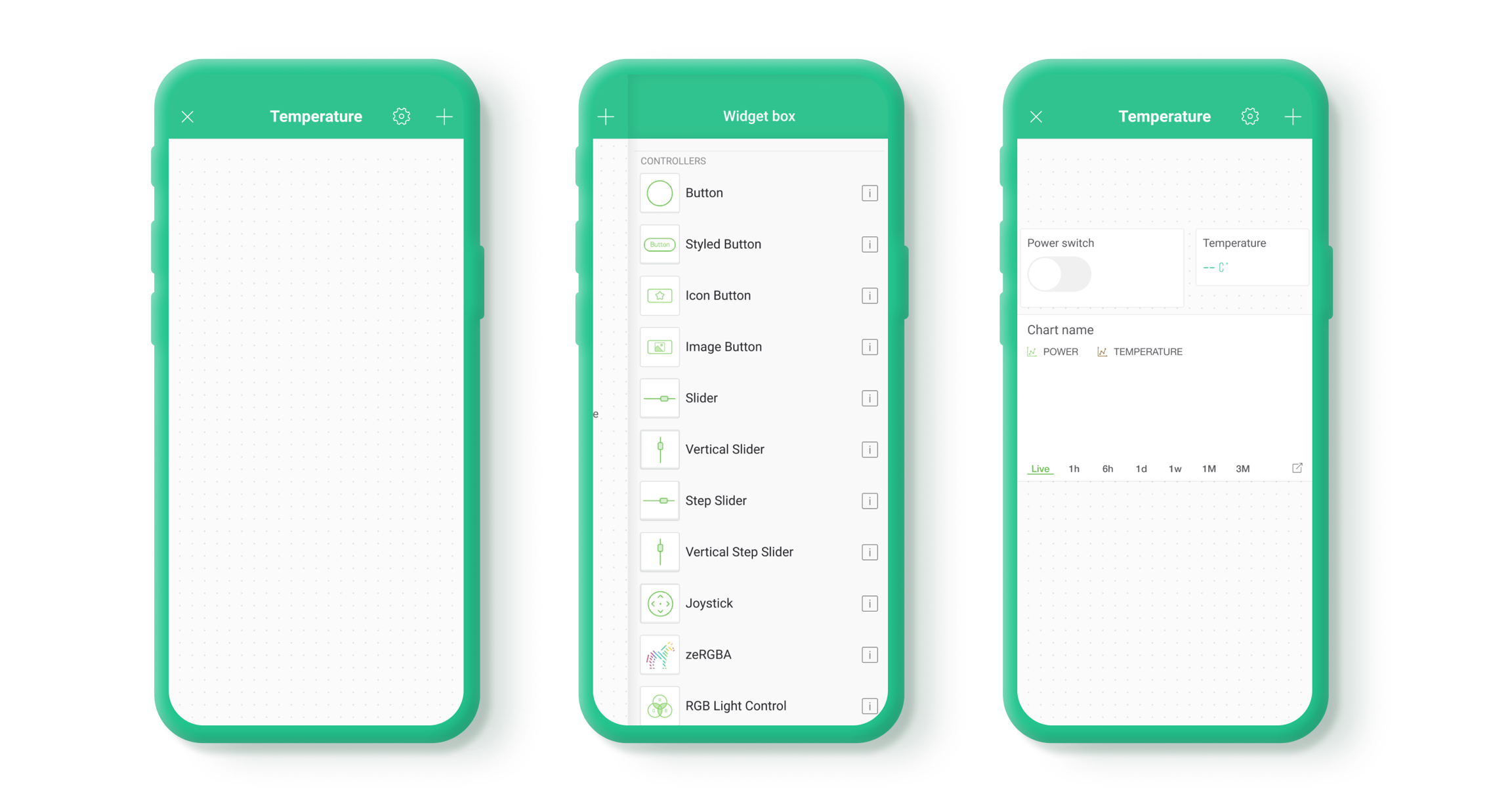 Mobile Dashboard is built from Widgets - modular UI elements which can be positioned on the canvas. Every Widget serves a special function (a button, a slider, a chart, etc). Every Widget has it's own settings based on its functionality