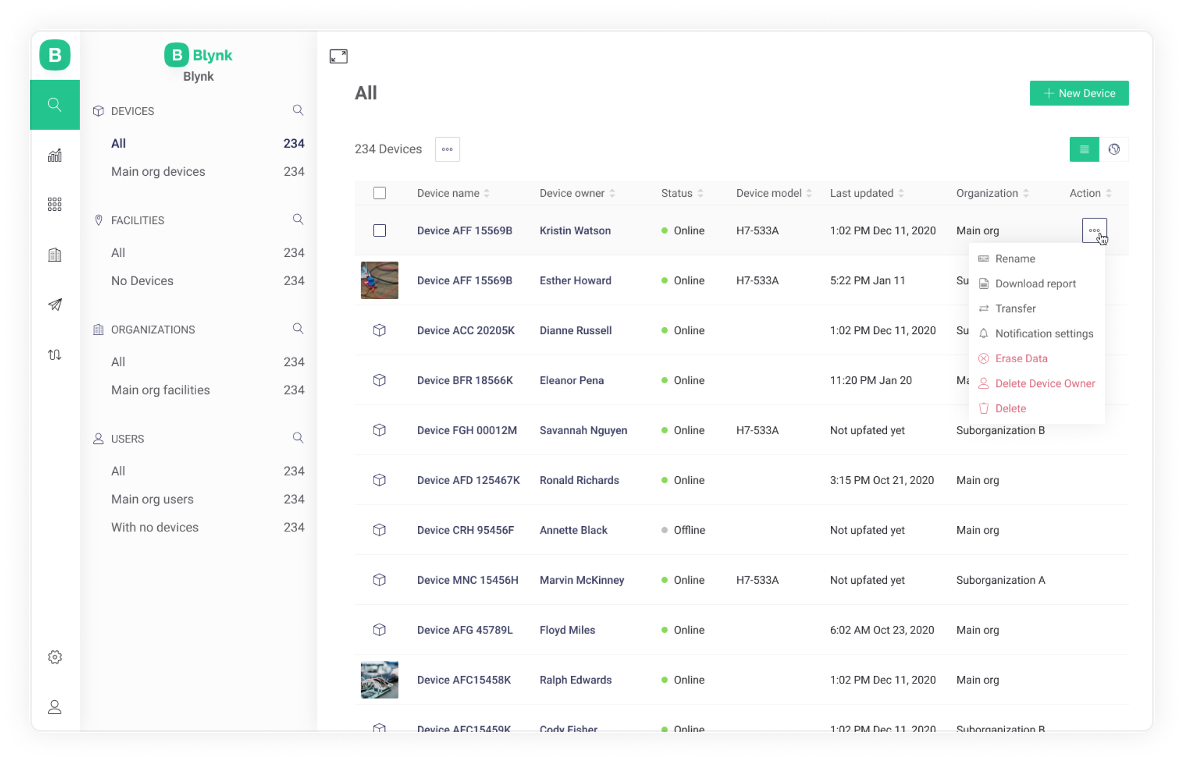 For example, you can create the sub organization, invite the new user to it, and transfer the device to this new user. After the transfer the device will be visible only for the user from the transferred organization and for all users with view organization devices permission enabled from the above, parent organizations along with switch organization permission.
