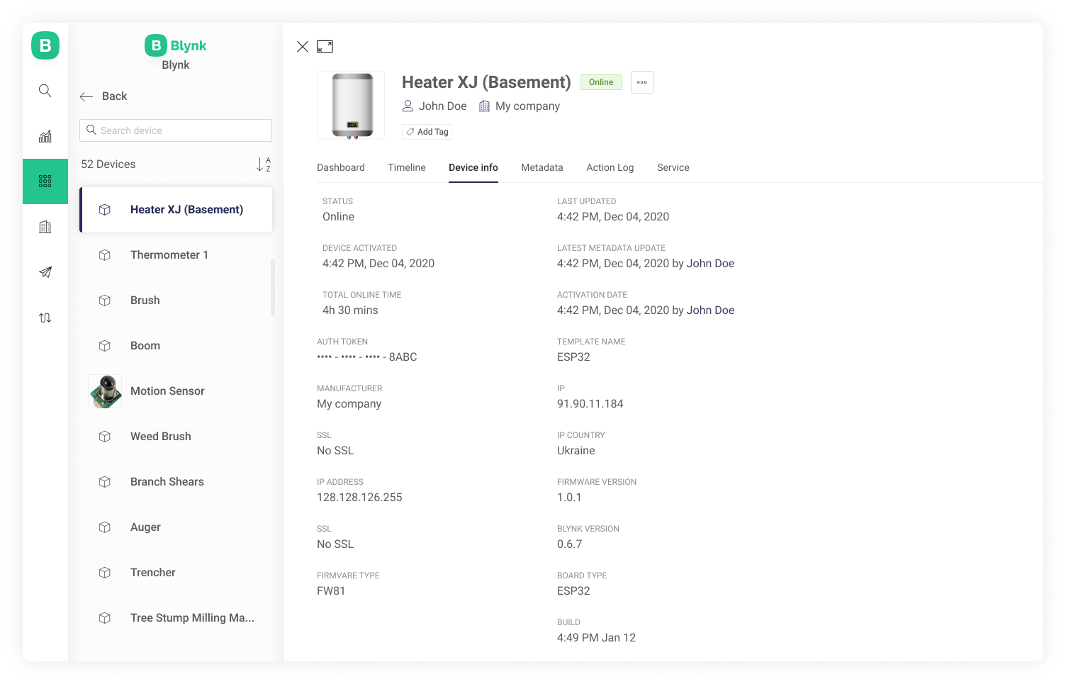 Firmware Version – actual firmware version of the Device (it can be changed by flash or Blynk.Air)