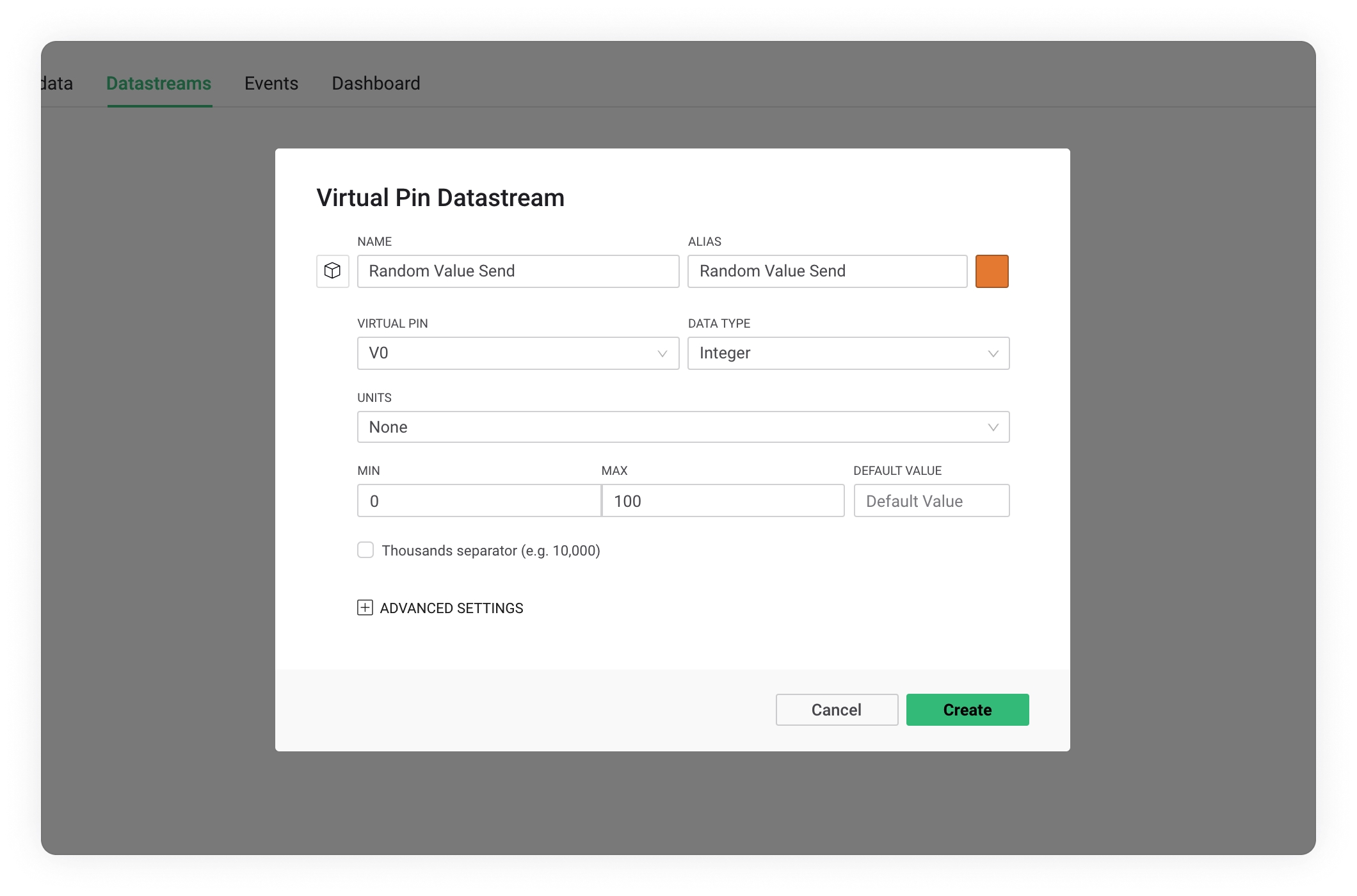 These settings mean that all the devices that inherit this Template will process integers in the range of 0 to 100 through a Virtual Pin V0