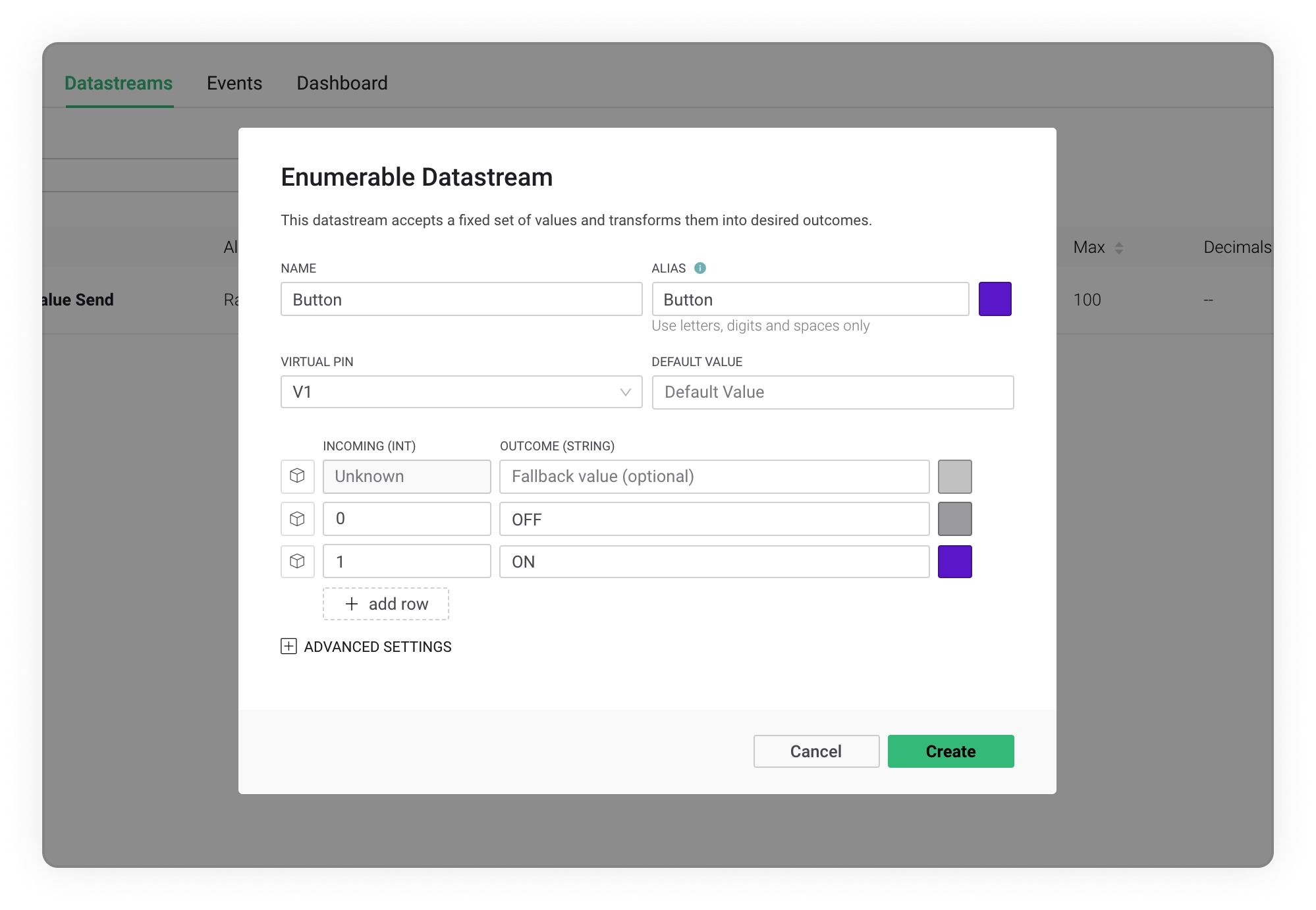 These settings mean that all devices that inherit this Template will process values integers in the range of 0 to 1 through a Virtual Pin V1and Blynk will interpret 0 as OFF and 1 as ON strings.