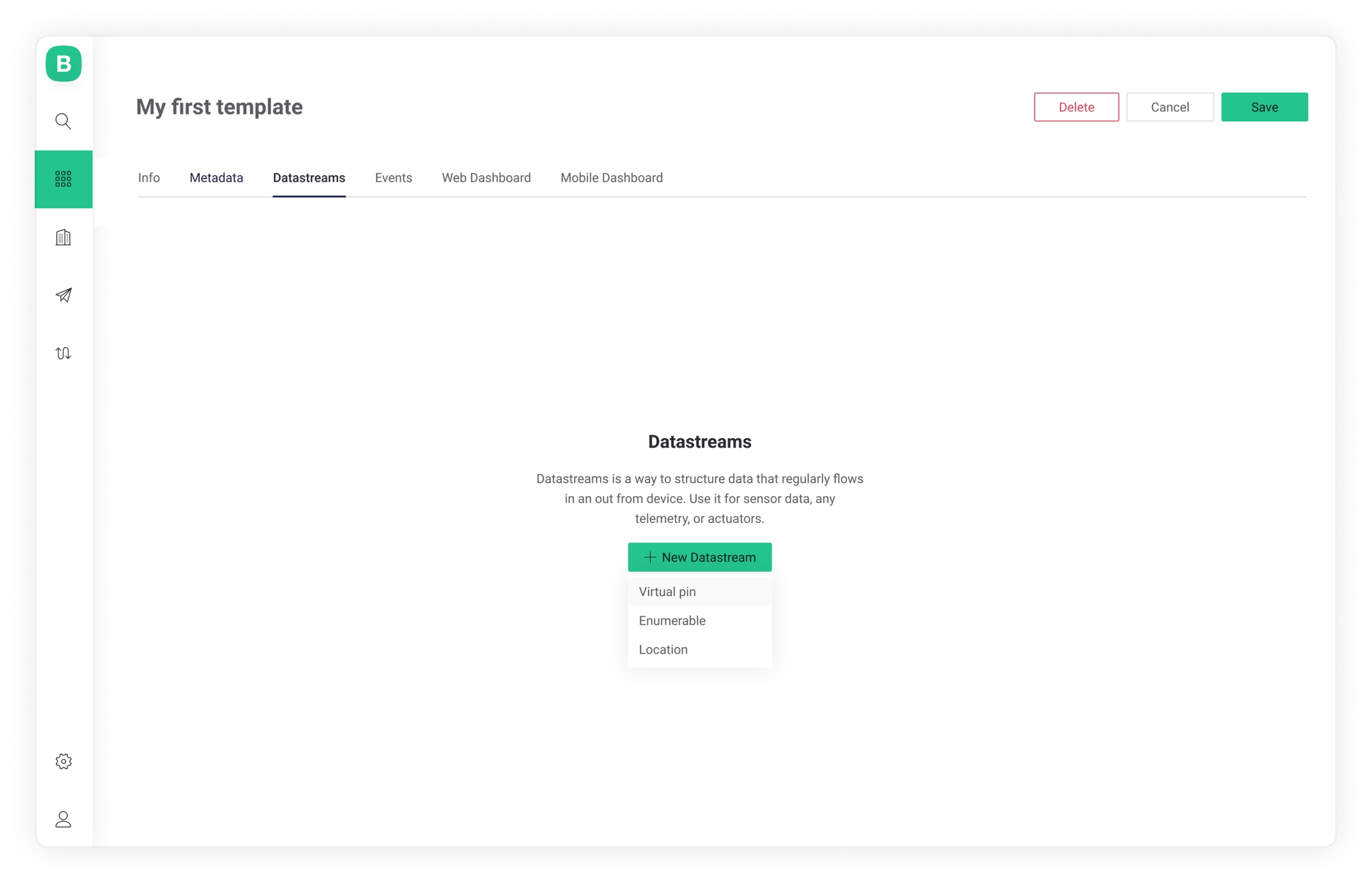 Click on Add Datastream button again. Choose Enumerable type in the dropdown menu and set up the Datastream. We will be using this Datastream to send a value from mobile and web dashboards to the device.