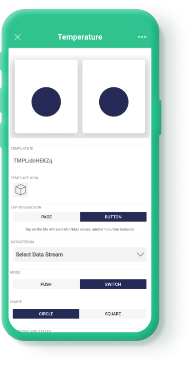 Let's select Button for this demonstration (you can edit it later). On choosing the preset, tile settings will open. Select the datastream that will be linked to the tile action.