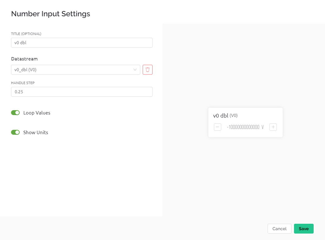 **Loop Values** - when disabled will cause the number displayed/generated by the control to stop increment / decrement of the values at the datastream [min value](https://docs.blynk.io/en/~/revisions/ynmC8lZ6FPocTYWigjcO/blynk.console/templates/datastreams/datastreams-common-settings/min-value) and [max value](https://docs.blynk.io/en/~/revisions/ynmC8lZ6FPocTYWigjcO/blynk.console/templates/datastreams/datastreams-common-settings/max-value). When enabled, incrementing past the max value will continue (loop) starting at the min value, and similarly decrementing past the min value will continue (loop) beginning at the datastream max value.